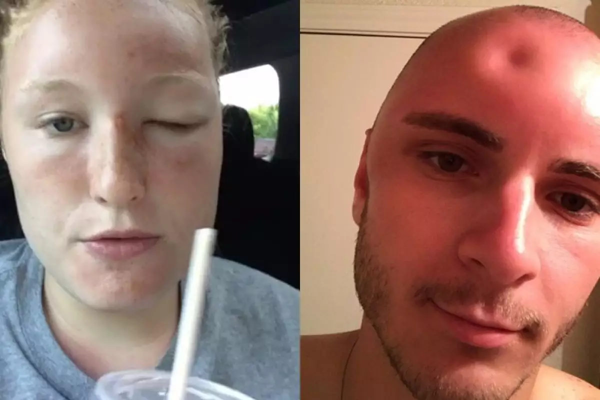Beberapa jam berjemur tanpa memakai krim tabir surya, pria ini mengalami pembengkakan pada dahinya. Jika bengkak ini dipencet, kulitnya akan 'penyok' dan membutuhkan waktu setengah jam untuk kembali seperti semula.