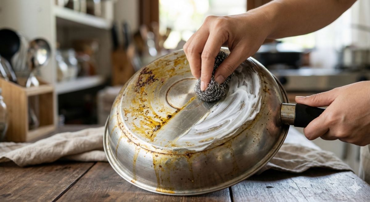 Kebanyakan orang mencoba menggosoknya dengan bahan abrasif keras, tapi cara ini justru berisiko menggores permukaan stainless dan mempercepat kerusakan teflon.