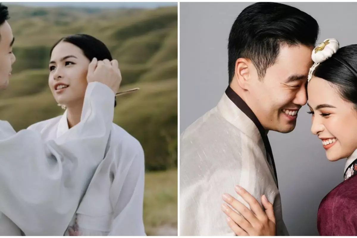 7. Maudy menutup unggahan potret prewedding dengan foto saat mengenakan pakaian tradisional Korea. Pada foto terakhir, sang aktris memakai hanbok Korea dengan nuansa warna merah maroon.