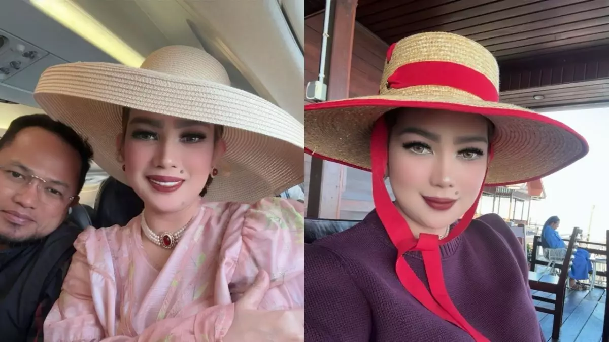 Dalam kesempatan yang sama bertemu si mbah-mbah, Sarifah memperlihatkan gaya ikonik dengan mengenakan topi bundar lebar dan gaun bernuansa merah-putih. Penampilan ini menonjolkan kesan formal namun tetap modis saat berada di luar ruangan.