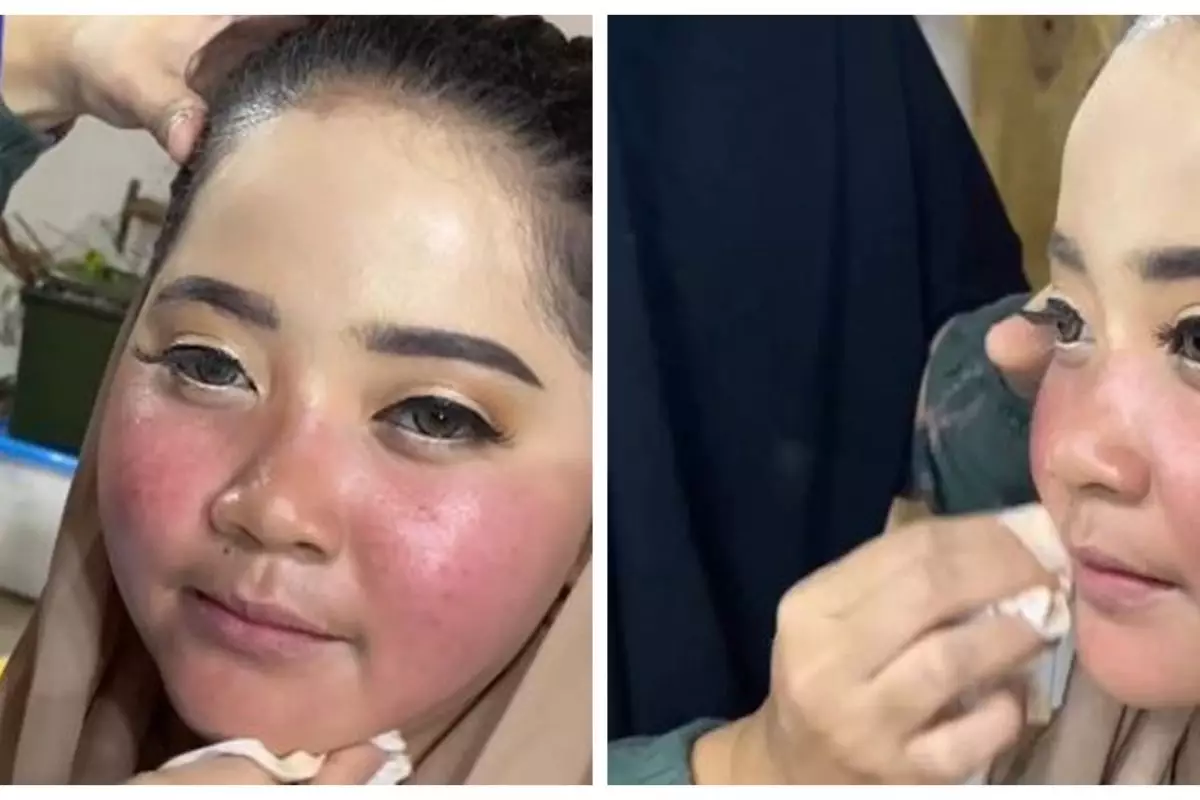 Penggunaan krim perawatan membuat kulit wajah wanita ini terlihat memerah. Entah iritasi atau kondisi kulit yang tipis. Meski glowing dan kinclong, MUA tersebut justru merasa kasihan dengan kliennya.